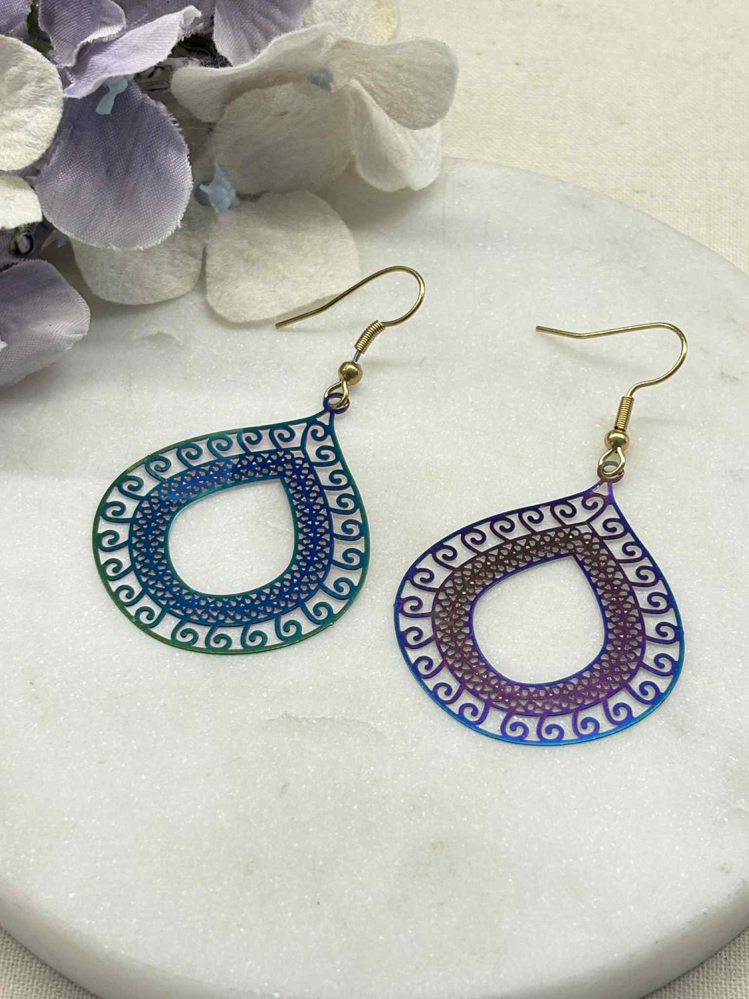 Extremely light metal holographic charms set on a gold hook earring. Their base colour is purple but as you move the colours change.